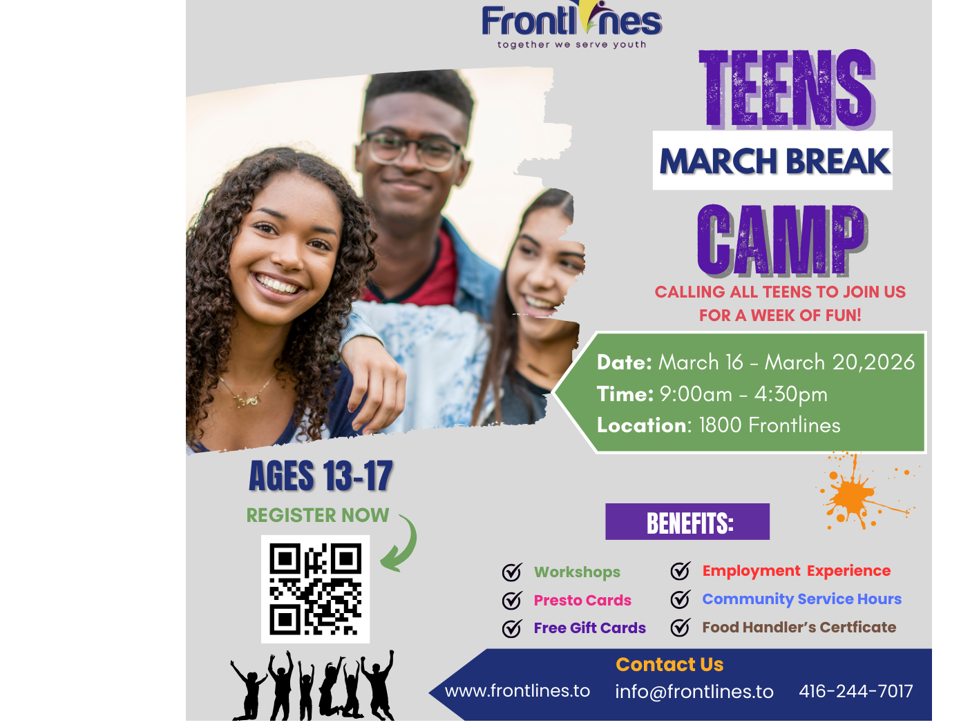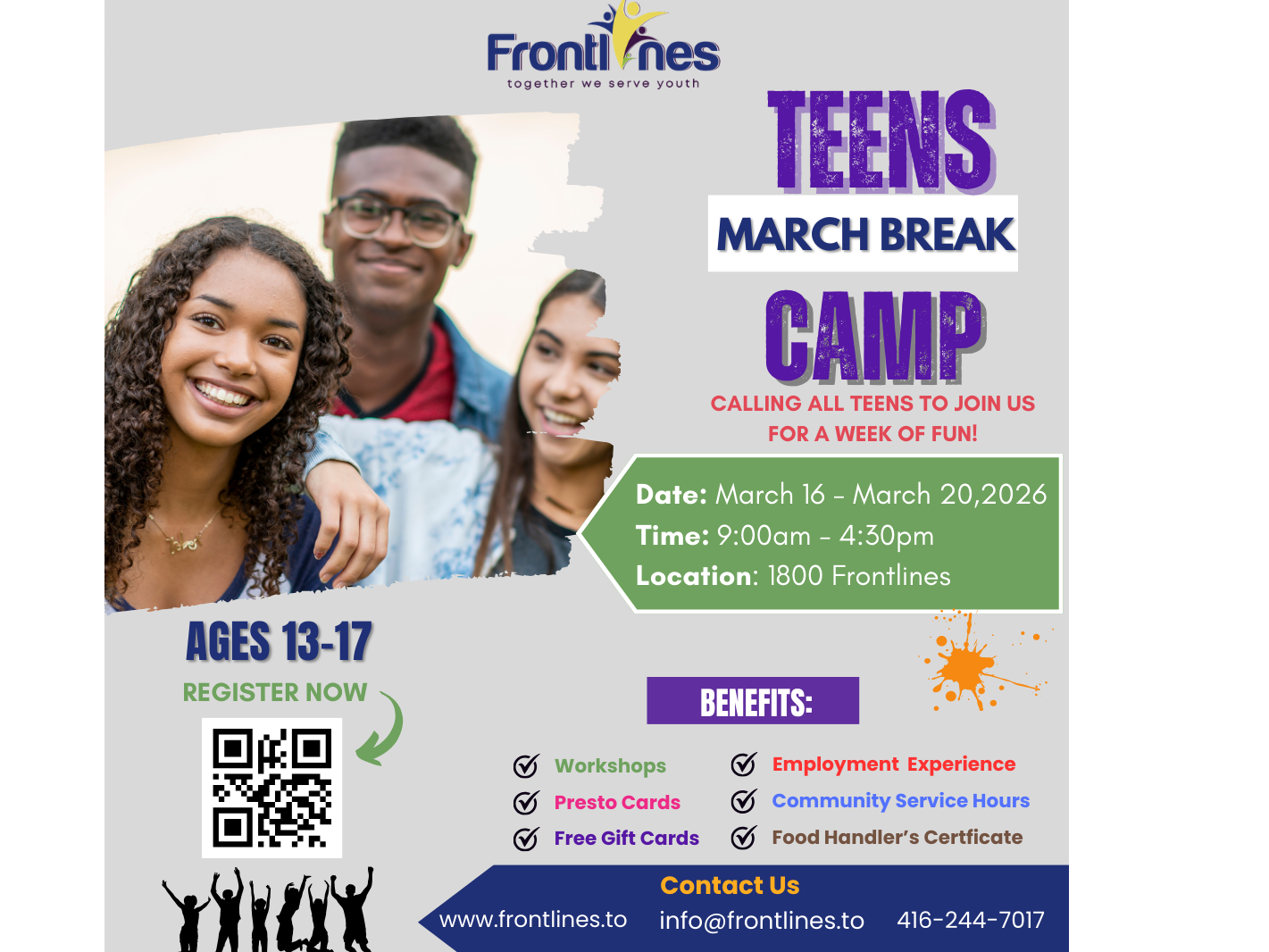 This March Break, teens will have the opportunity to earn community service hours while participating in exciting activities. Meals are included, with a one-hour lunch break each day, and a chance to earn Standard First Aid, Stop the Bleed, Food Handler Certification and more !